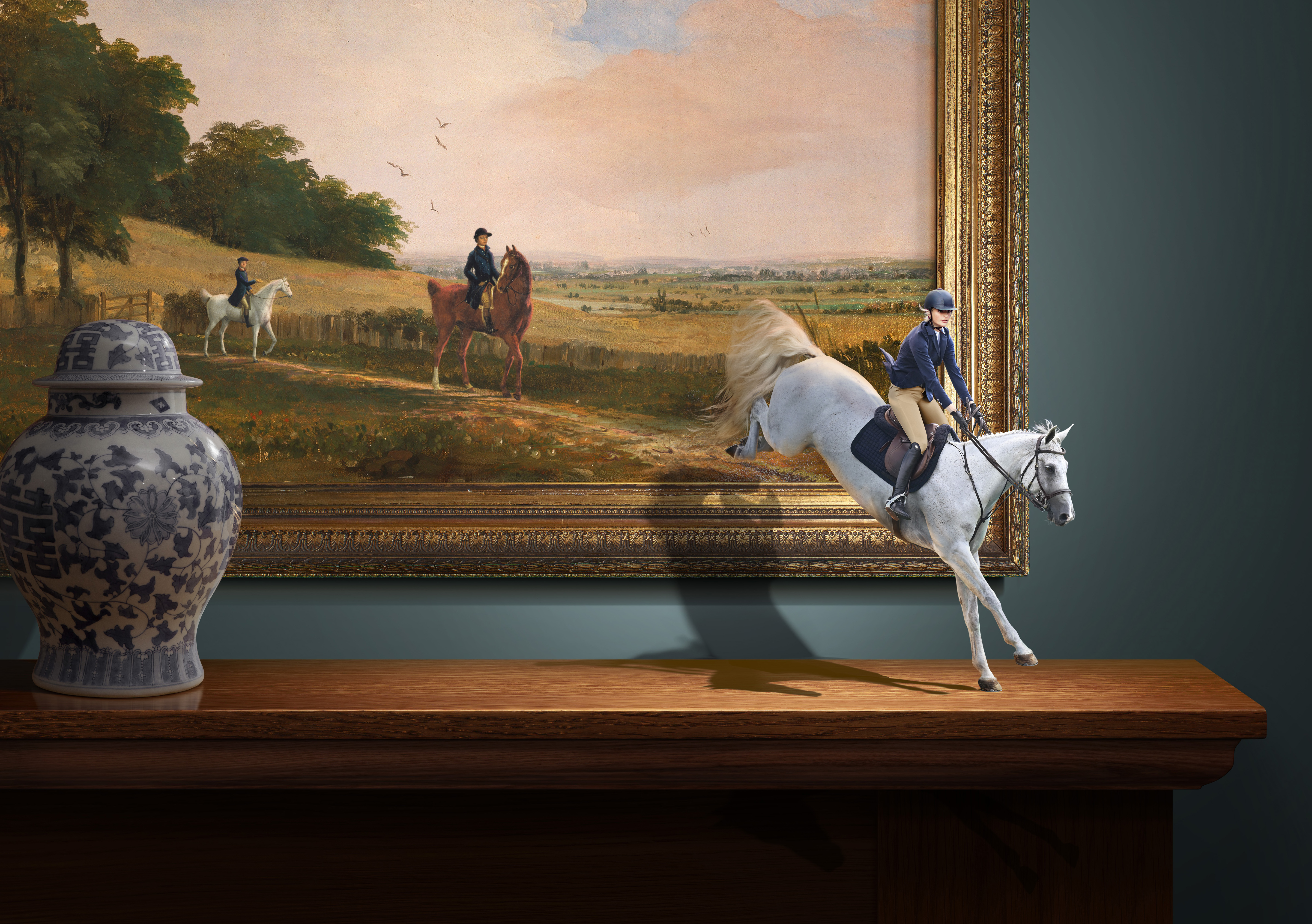 A carefully curated shortlist of paintings in the public domain that had the right tone and content were entirely recomposed and digitally embelished to create the painterly country scene. Props and adapted stock sports photography completed the image.